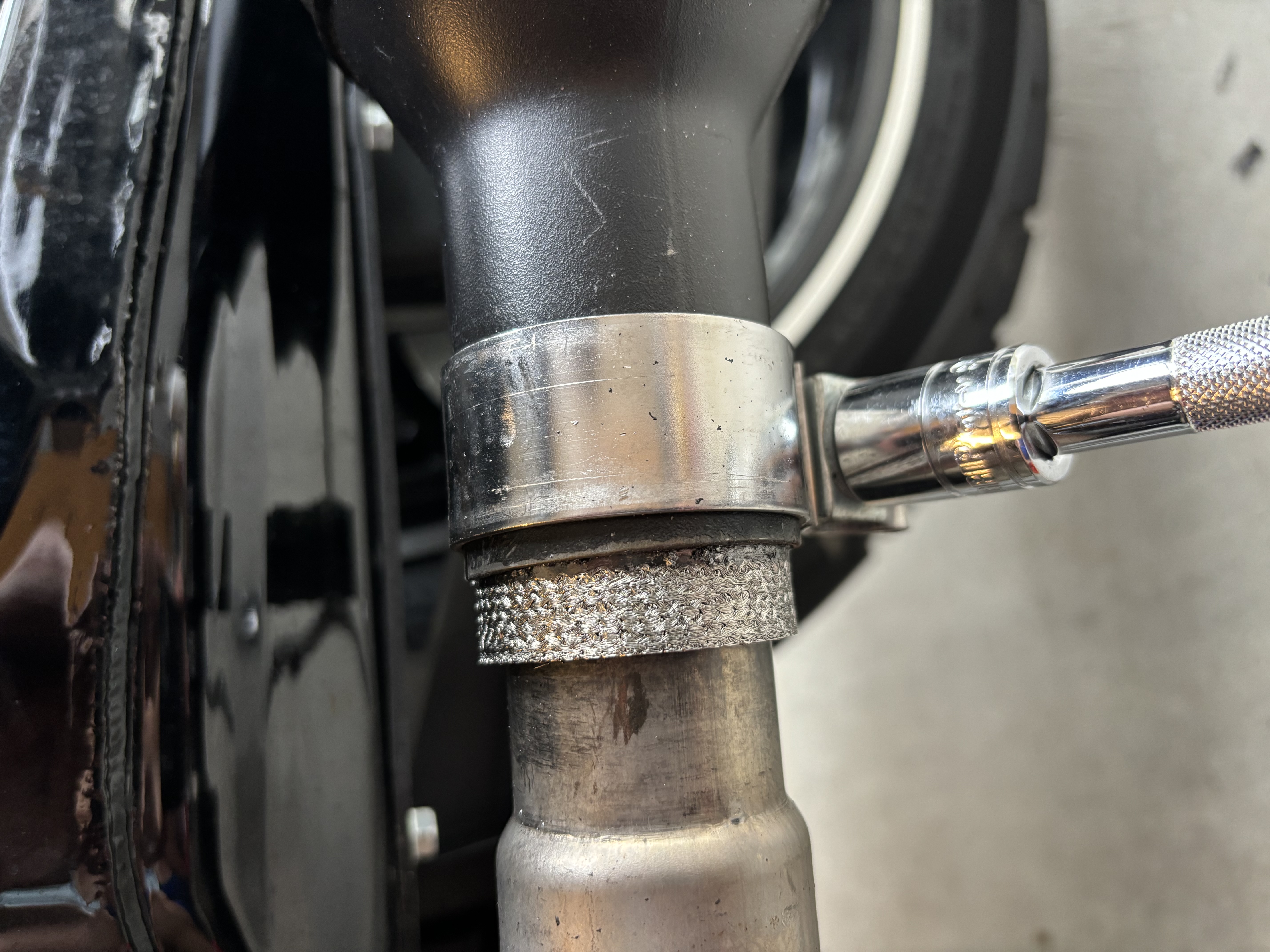 マフラー端とメッシュの境目が合わさる位まで差し込み、エキパイとジョイントします。