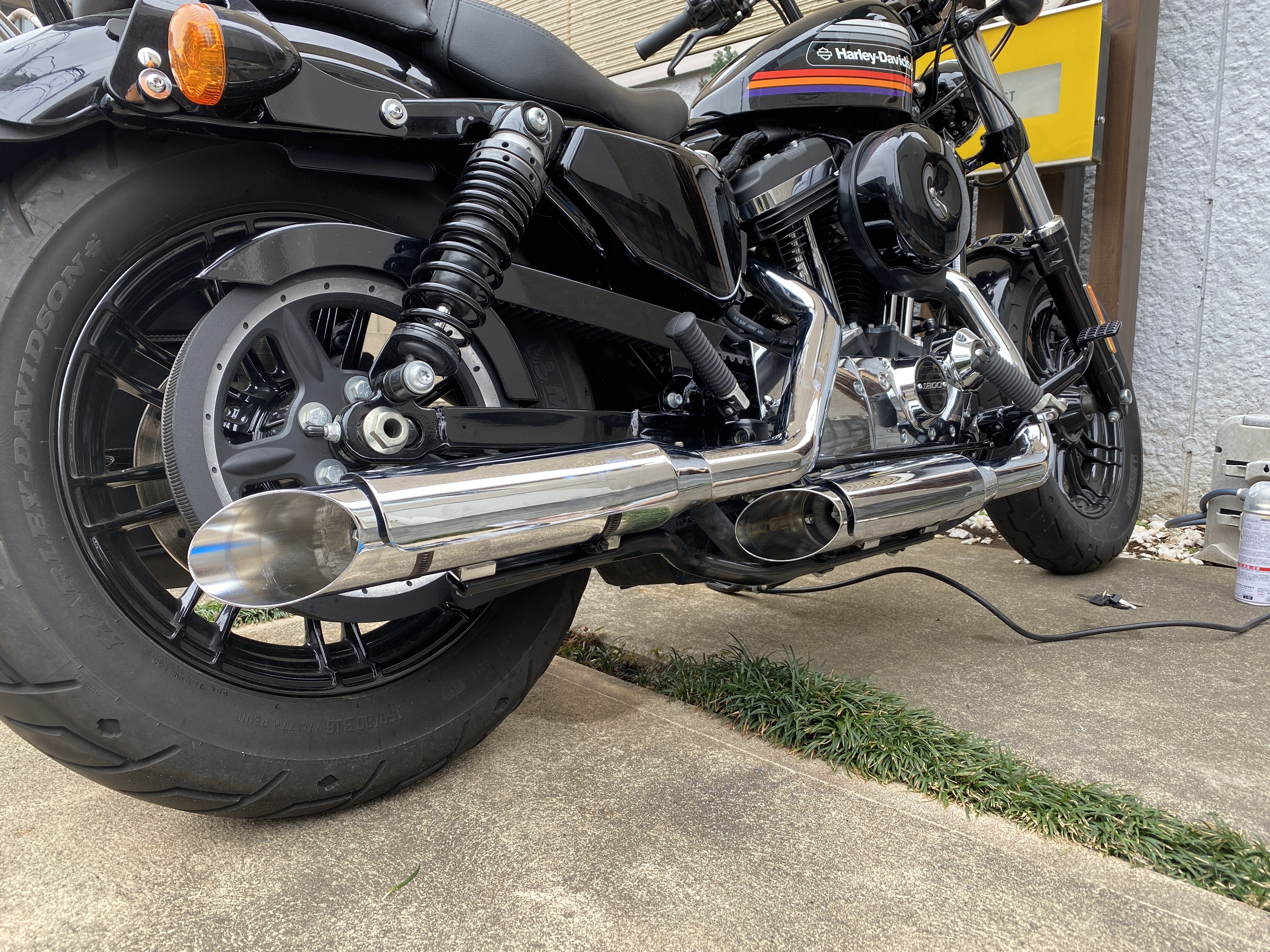 マフラー交換と同時にエアクリもスクりーミンイーグルに換え、FP3で燃調もしました。エアクリもマフラーも交換、63歳のおやじでも何とかなるもんですね。クロームワークスの音、ハーレーらしい音で満足。最初にエンジンかけた時は、わぁ、うるせい!と思いましたが、アイドリングを落とし(850)たり、耳慣れたのせいもあり、大きい音ではありますがいい音と感じております。交換し、FP3で燃調してよかったと思います。なお、FP3にはクロームワークス、standard Buffleと言う選択があったのですが、PVさんのブログ?にクロームワークスマフラーにはVans &HeinsのマフラーでquietBuffleが最適(FP3にKWの登録がない時の名残?)と出てたので、それで燃調しました。今後、色々試してみようと思います。今後とも宜しくお願いします。