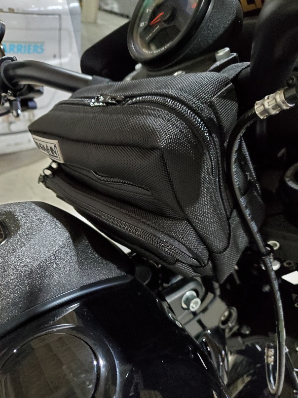 ノーマル状態でハンドルをいっぱい切るとタンクコンソールに当たりますが走行中は躱せています。長財布が入ります。