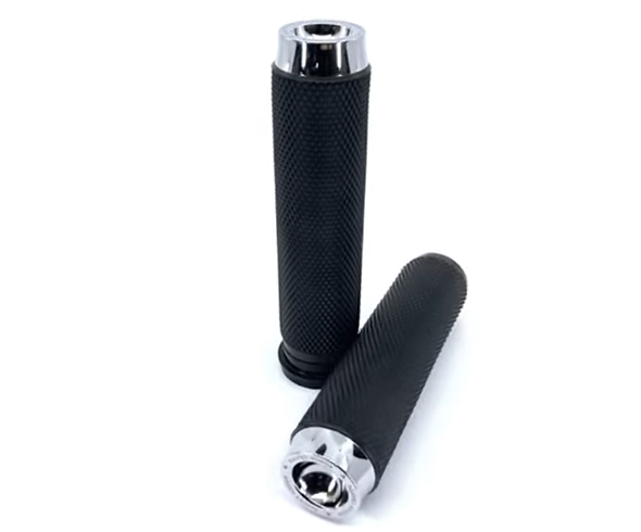 ラバー部分のローレット加工が、グローブをしていても確かな握り心地を実現します。また、美しいクロームメッキが、高級感をプラス。バーエンド部分にカスタムグリップのアクセントを与えてくれます。