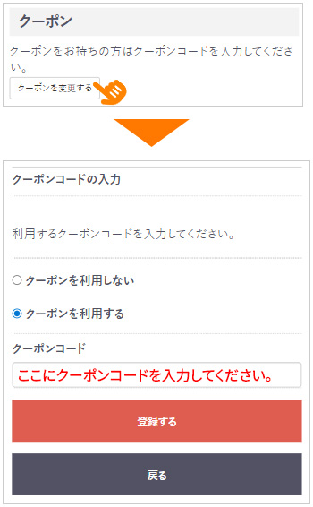 2. ご注文手続き画面で「クーポンを変更する」ボタンを押して、クーポンコードを入力→登録する