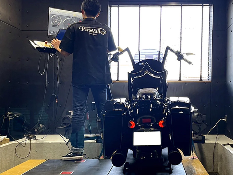 ダイノマシーンを使用し、愛車の最大出力やトルクを可視化します。パフォーマンスを数値やグラフで確認するまさにハーレーの健康診断!