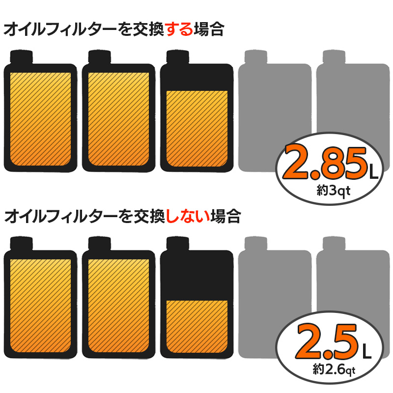 エンジンの血液となるエンジンオイルは、オイルフィルターを交換するかどうかで必要なオイル量が変わります。