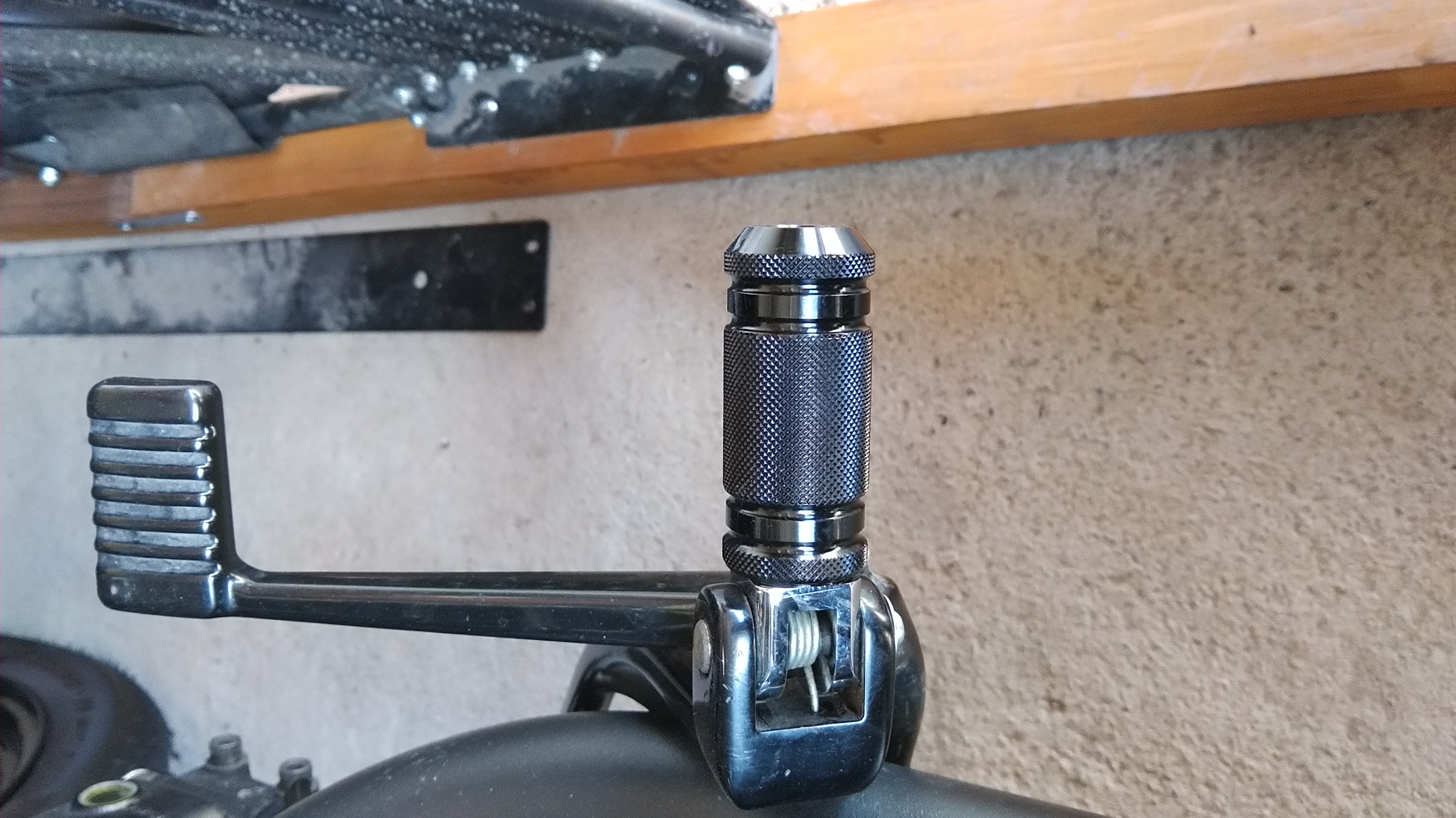 やや細身で短め、ローレットデザインのフロント用フットペグ