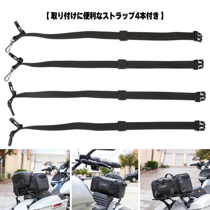 幅広い取り付けを可能にする4つのストラップが付属しています。様々なバイクへの取り付けに対応可能です。