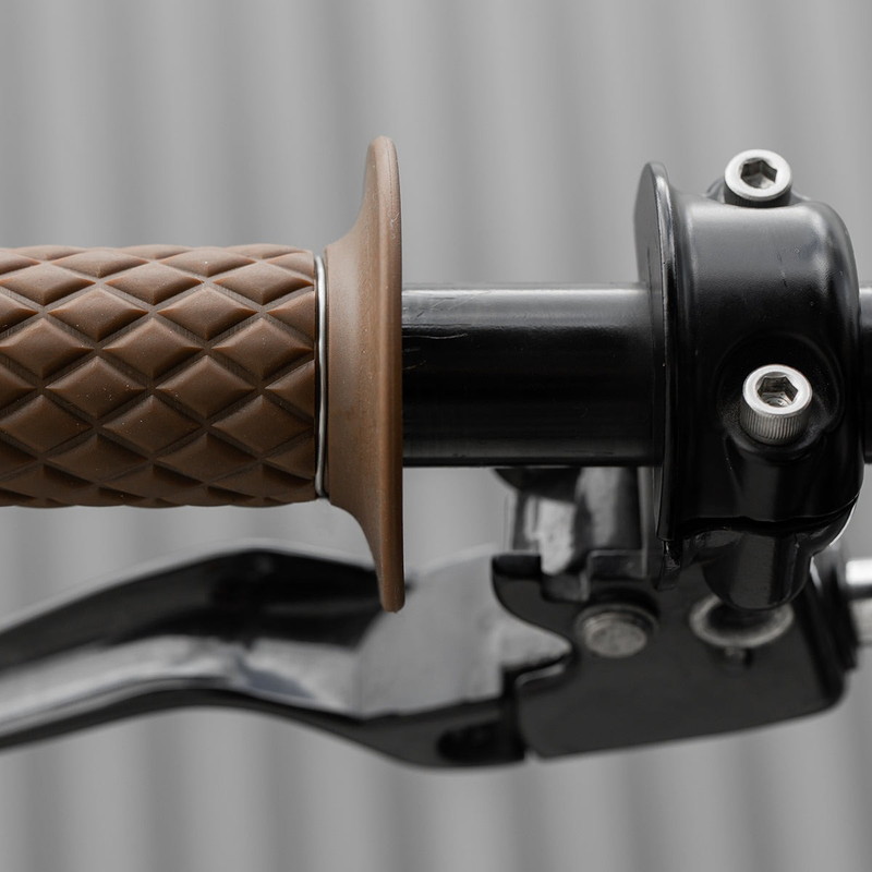 ●背の高いフランジ(グリップ親指側のツバ)が、スロットルやハンドルコントロール時の不快感から手指を守ります。