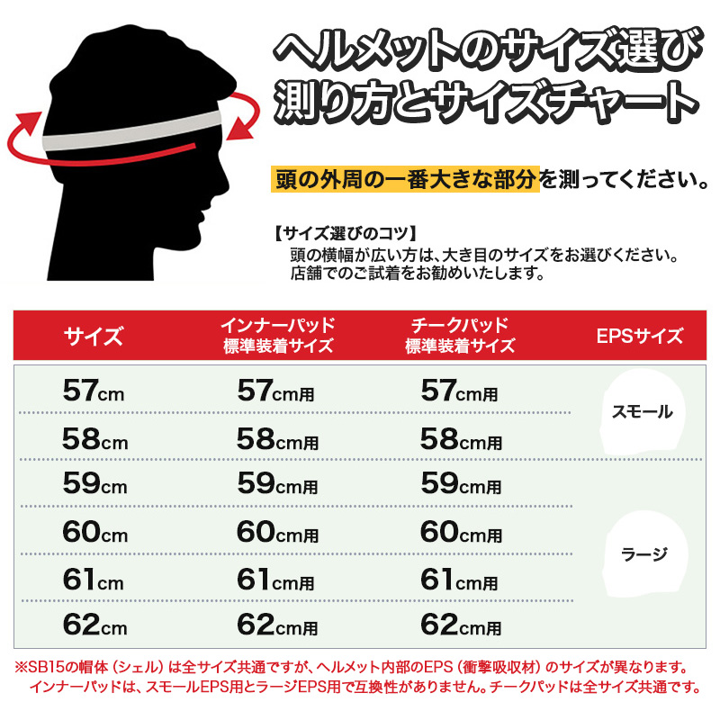 SB15のシェル(帽体)は全サイズ共通ですが、内部EPSのサイズが異なります。