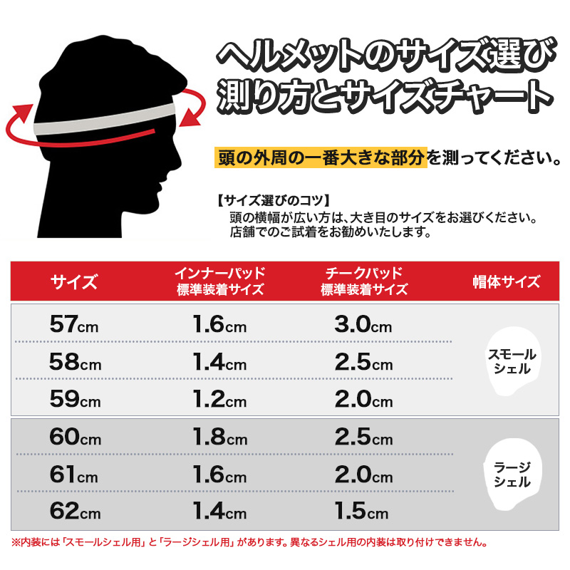 57~59cmはスモールシェル、60~62cmはラージシェルと、サイズにより帽体サイズが異なります。