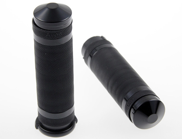 1インチハンドルバー&スロットルケーブルのモデルに適合する、クールな印象を与えるブラックのグリップです。アルミニウム素材を最新の5軸CNCマシニングセンターで加工し、ブラックパウダーコートで仕上げています。グリップ部分は表面に滑り止めのラバーを施しています。