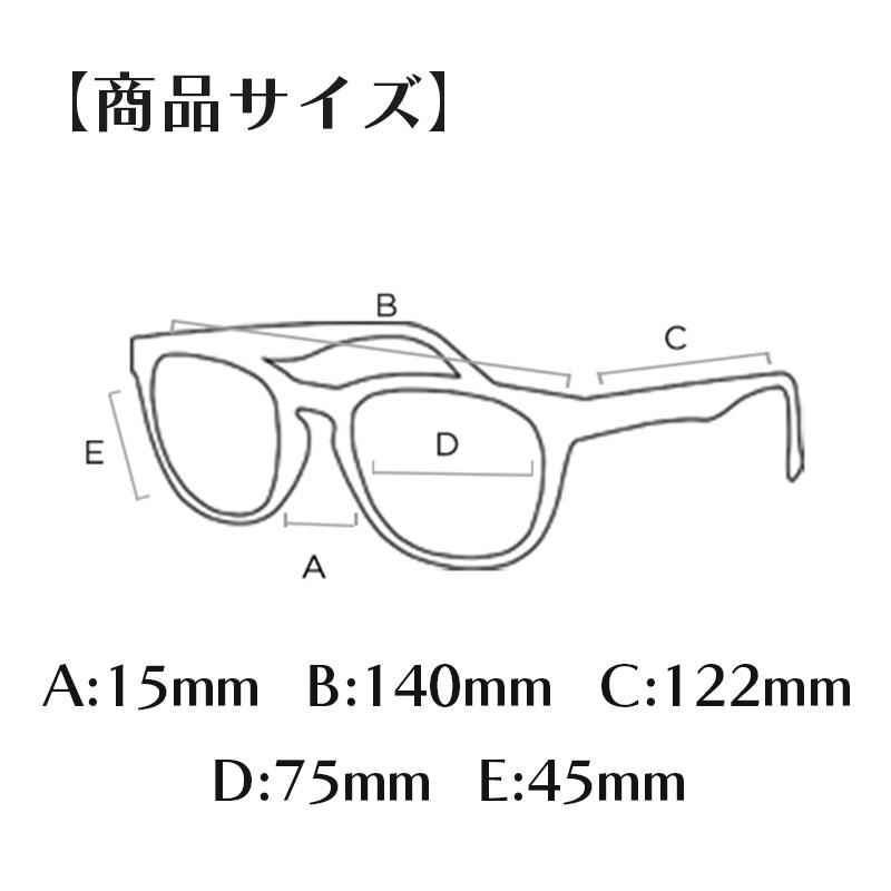 ●サイズ:A・ブリッジ幅15mm、B・フレーム幅140mm、C・テンプル長122mm、D・レンズ幅75mm、E・レンズ長45mm