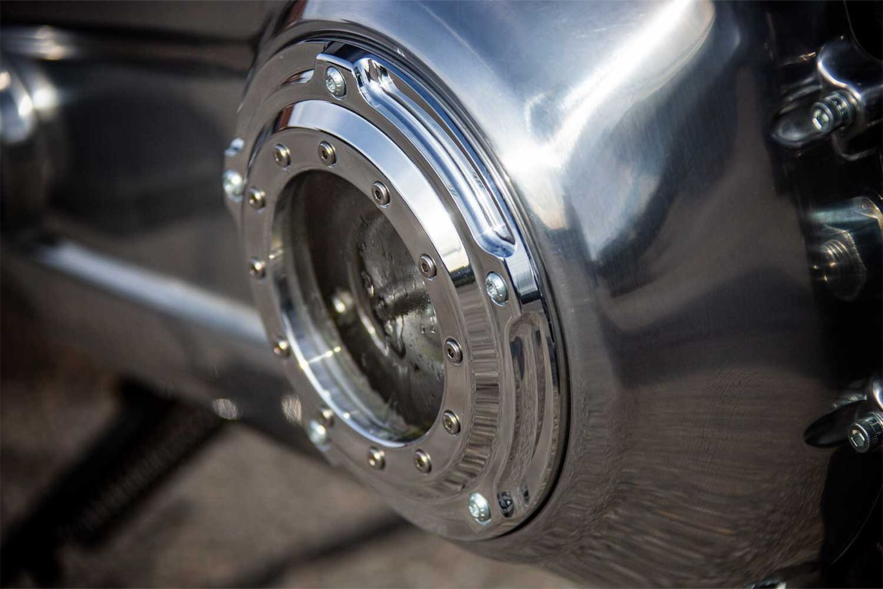 ●透明な窓がついたリックスモーターサイクルズのダービーカバー、ナロープロファイルプライマリー搭載のツーリングモデルにピッタリ合うように設計されています。