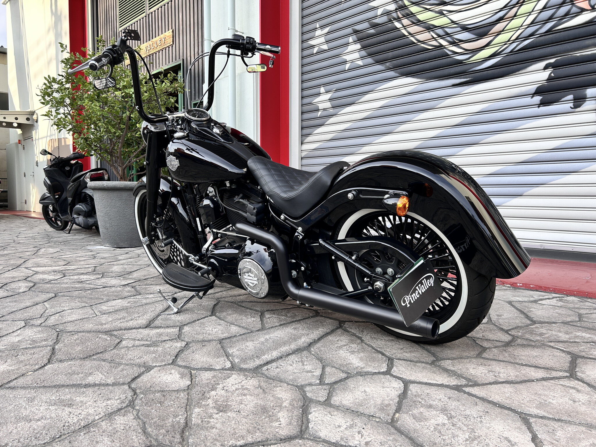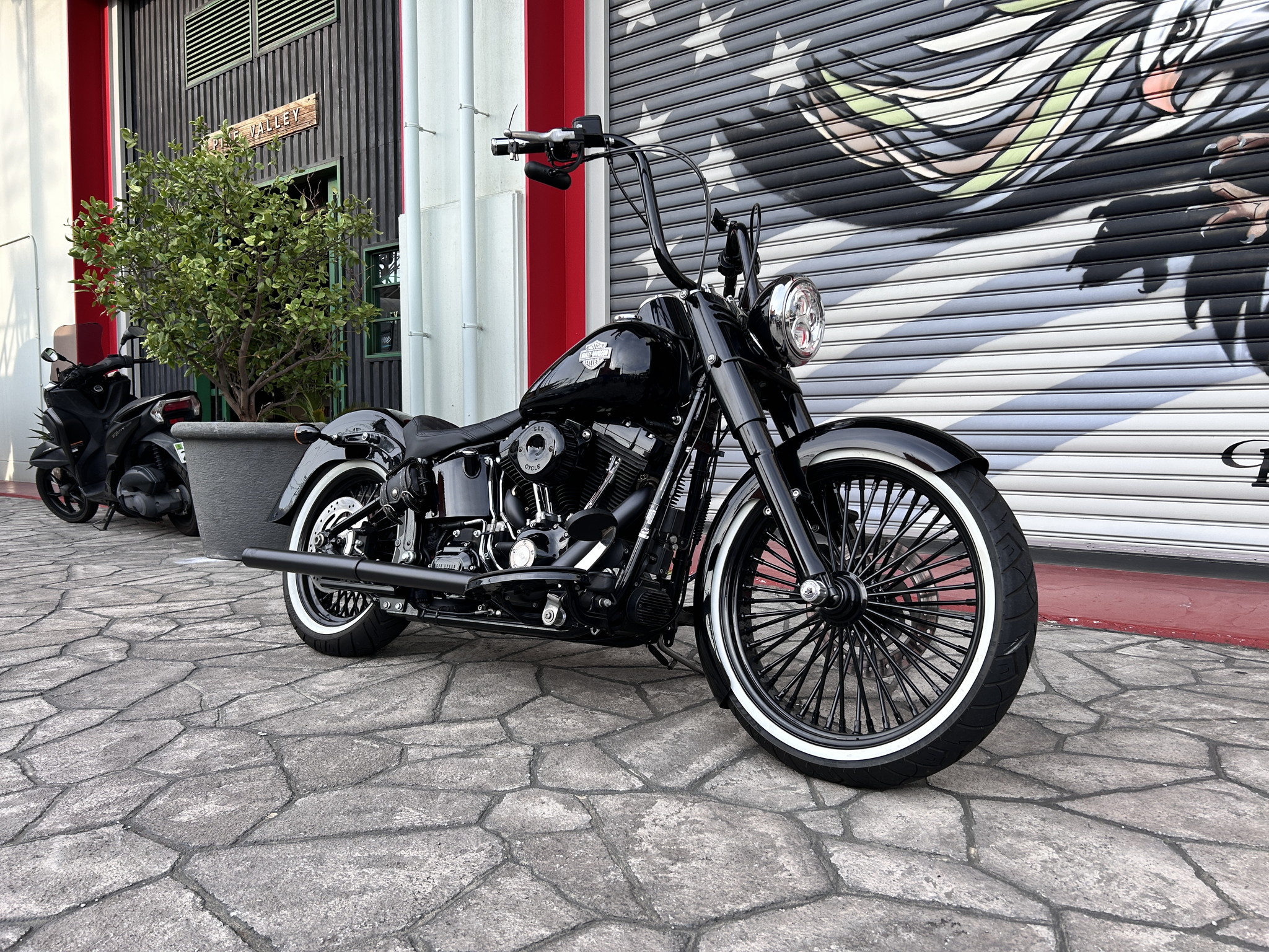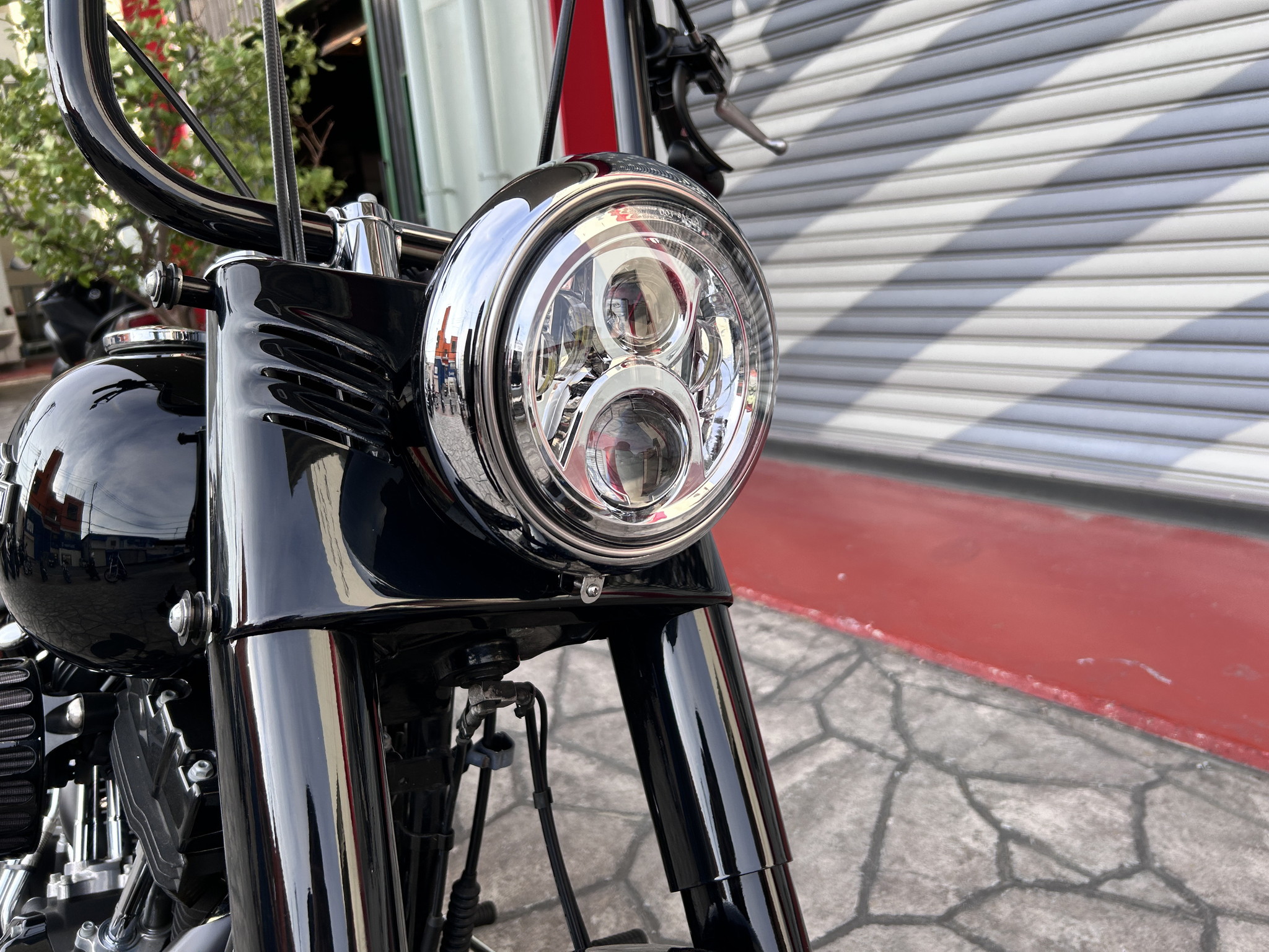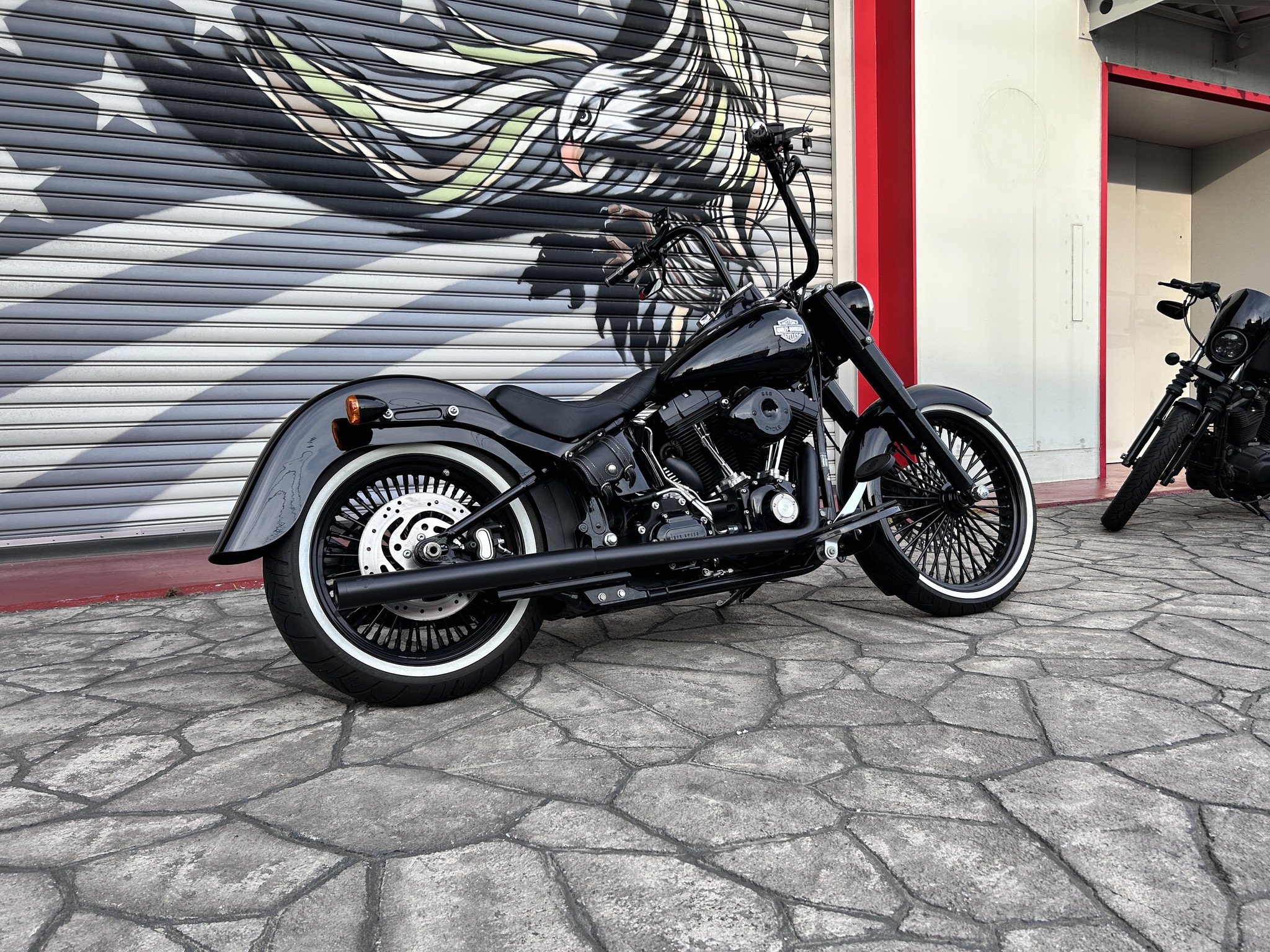 カスタムパーツをふんだんに使用、迫力のあるチョロスタイルに仕上げられた、ツインカムソフテイルスリムです。各部品にはパウダーコートを施し、全体をブラックアウト仕様としています。クロームベースのチョロスタイルとは違い、引き締まった印象のカスタムに仕上がっています。