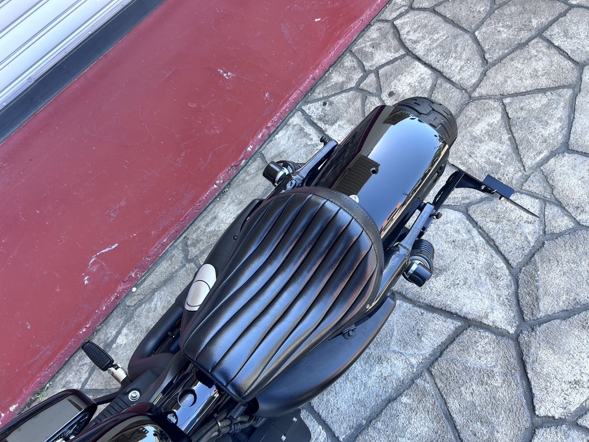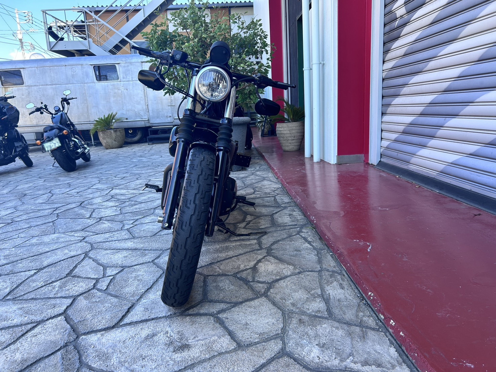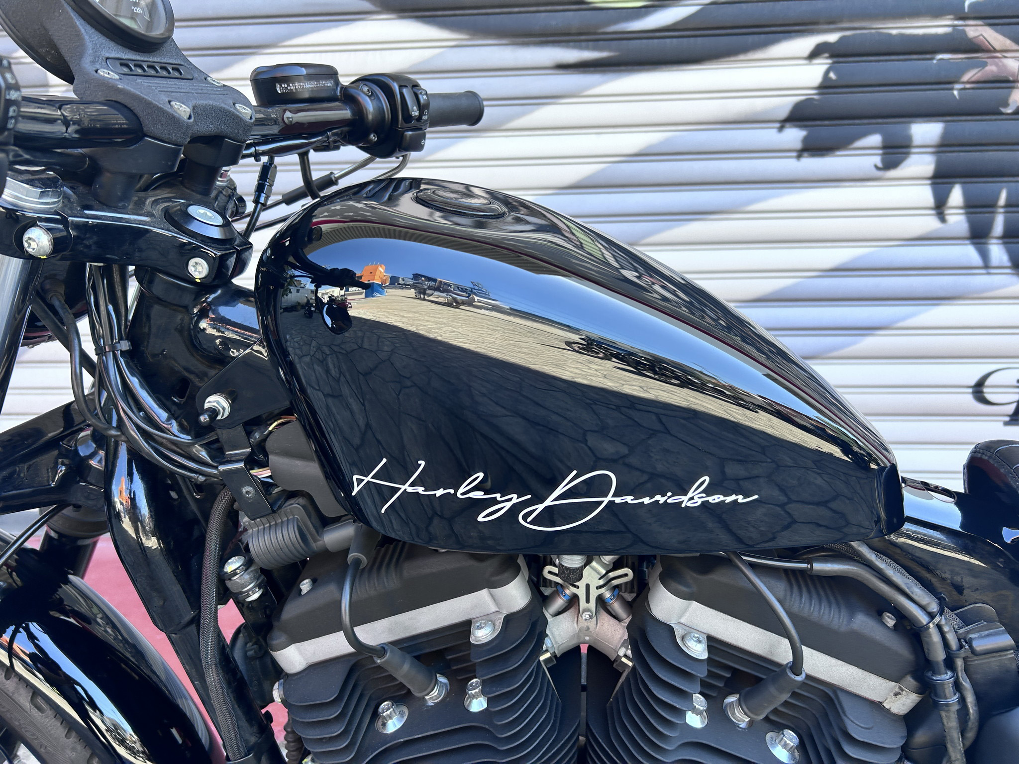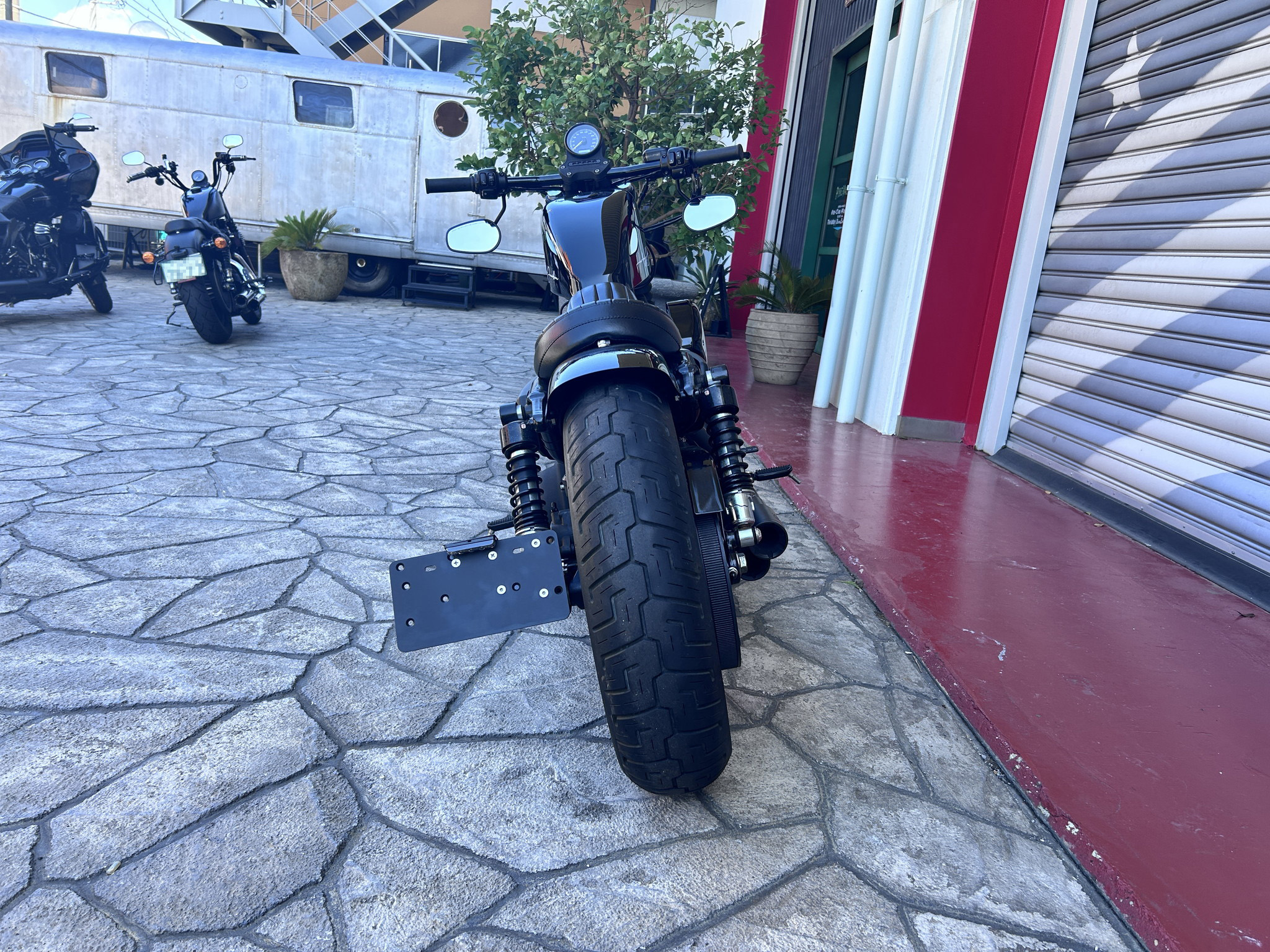 こちらはフォーティーエイト純正タンクに換装された883アイアンで、低く構えたハンドルバーにフレームカット、チョップドフェンダーを組み合わせ、現代的なボバースタイルへと仕上げられています。
