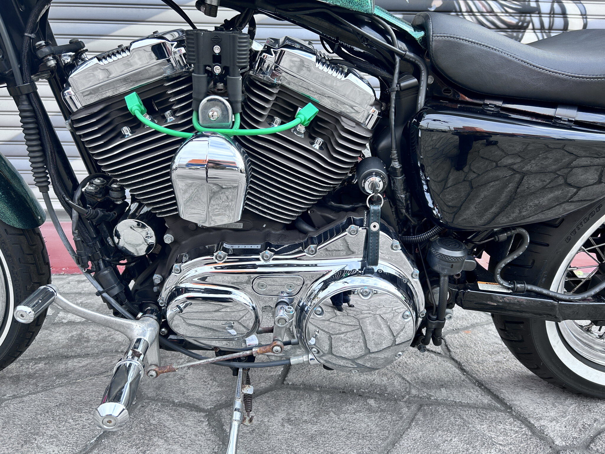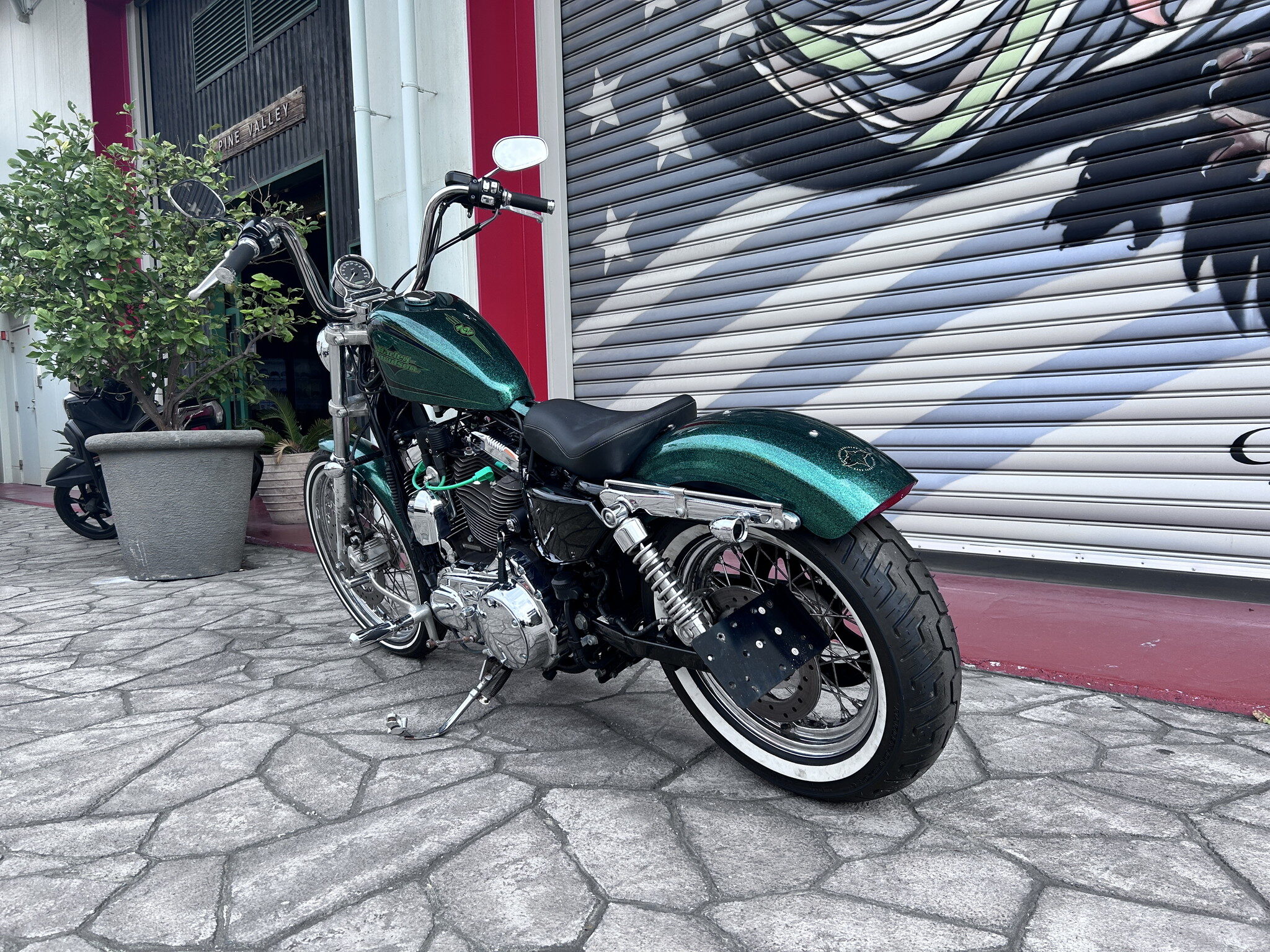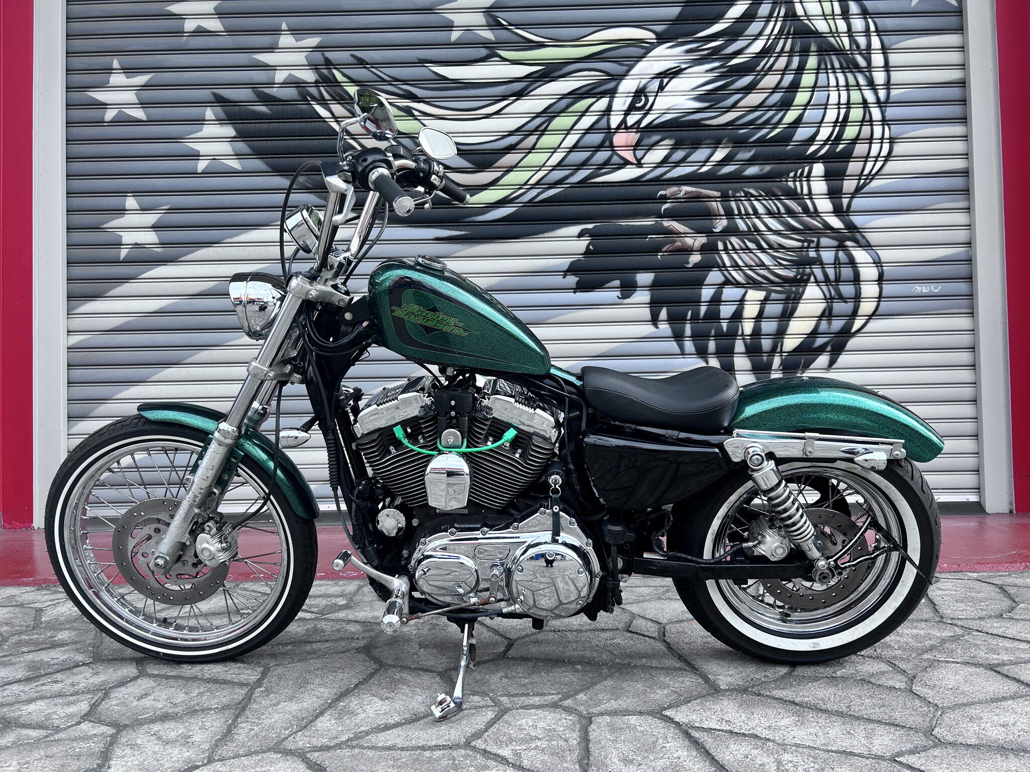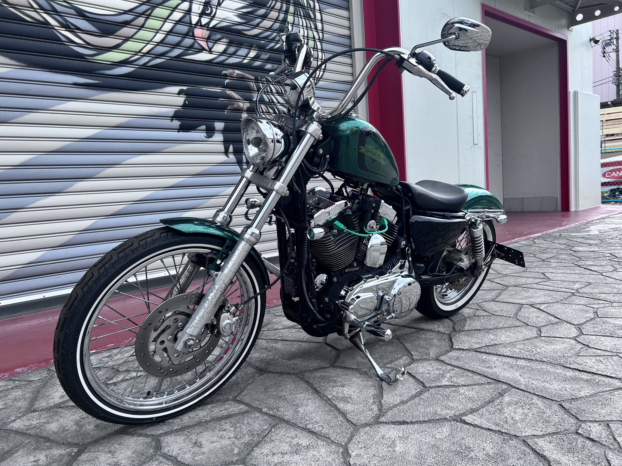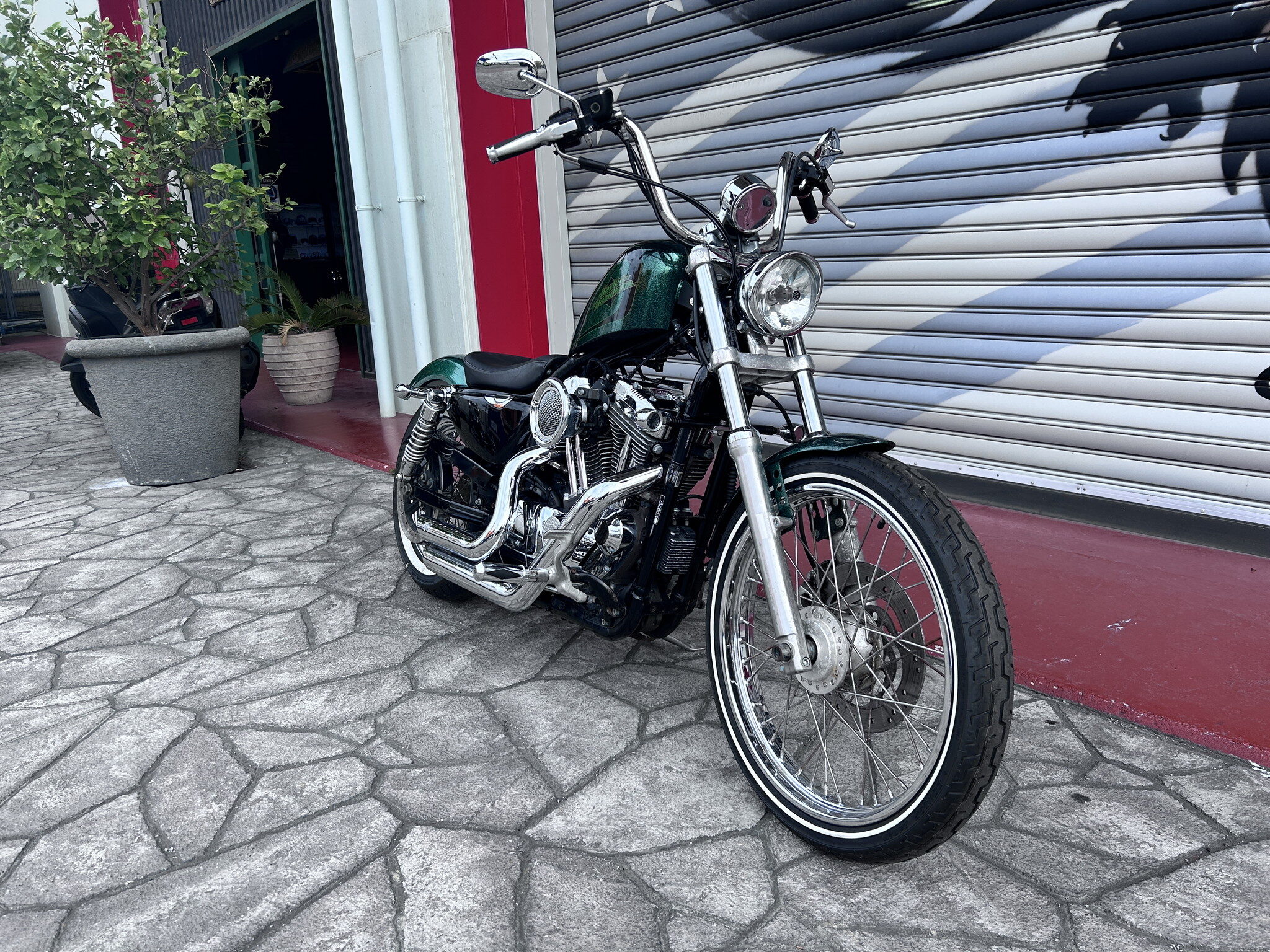 希少な絶版スポーツスターモデルが入庫しました!キャンディグリーンフレークの外装とクロームの輝きが特徴的で、車体全体に統一感あるカスタムが施され、見た目・走りともに存在感バツグン。ストリートでもガレージでも映える、個性あるスポーツスターをお探しの方におすすめです。
