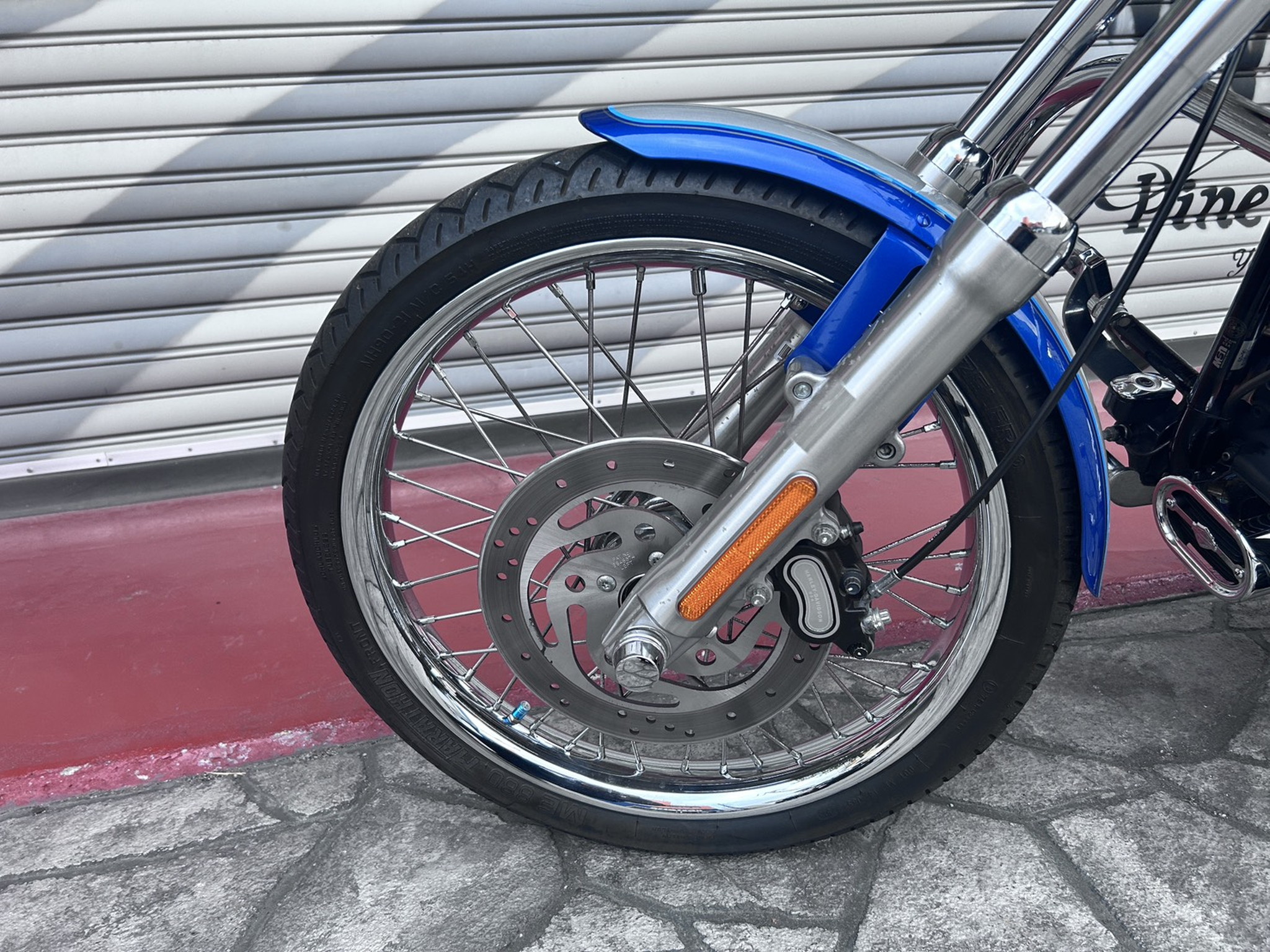 鮮やかなブルーとシルバーのツートンペイントが美しく、クラシカルな雰囲気をまといながら、アメリカンチョッパーの王道スタイルを体現しています。