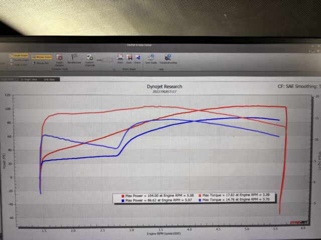 純正データはパワーとトルクの谷が目立ちますが、チューニングで低速から綺麗に吹け上がり、更にカムで100馬力を超えるパワーアップもしました。