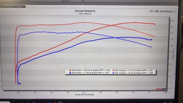 グラフの通り、低中回転のトルクUP、パワーは低回転から高回転まで綺麗に伸びています。