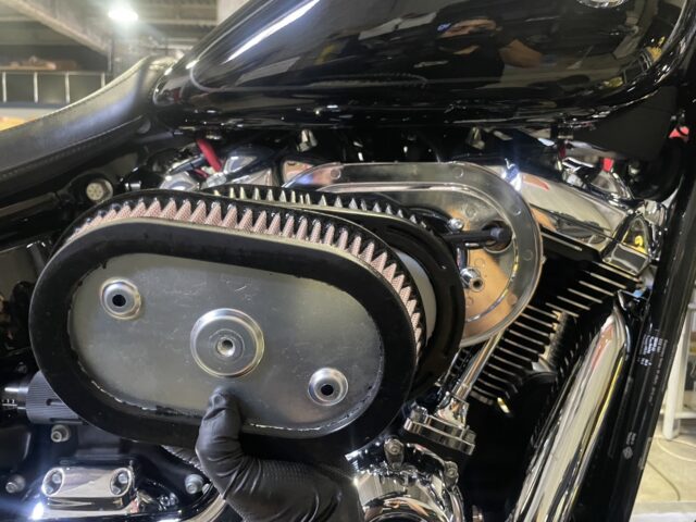 今回は、ノーマルエアーフィルターをスクリーミンイーグルのハイフロータイプのものに交換しました。