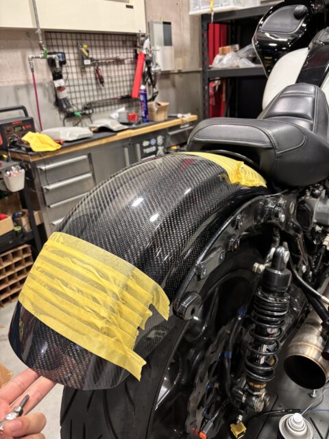フロント、リアフェンダー、サドルバッグをカーボン製のものに交換していきます。