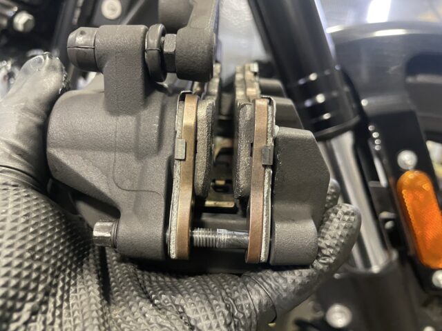 キャリパーの清掃は、溜まりに溜まったブレーキダストの除去とピストンの動きの確認を行いました。