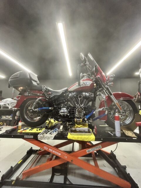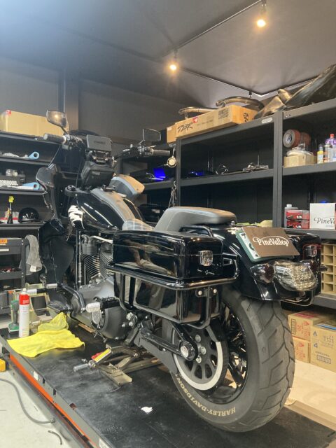 そして、先日弊社で塗装、組み付けをさせて頂いたFXR DIVISIONのサドルバッグを早速お客様ご自身で取り付けされたようで、やはりカッコよさ増し増しでした!個人的に好みですし、純正と違うルックスは目立ちますね!