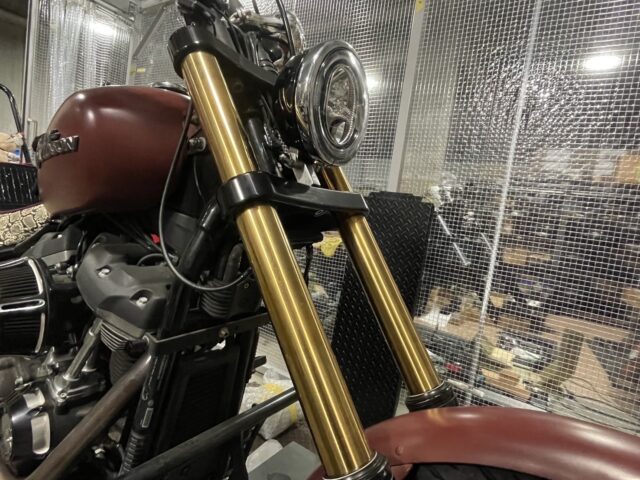 現在作業しているFXBBですが、フロントフォークのインナーチューブがゴールドに変わっています。