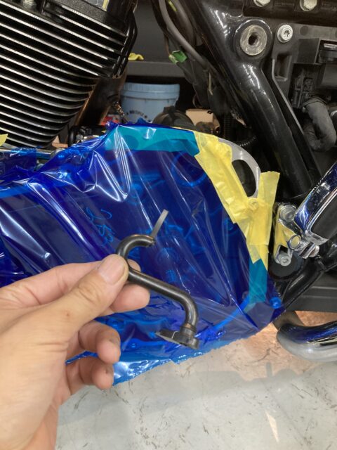 カム交換とチューニングご依頼のFLHXSEですが、プライマリーケース内の負圧によって、ミッションオイルがプライマリー側に吸われて流れ込む症状が出たため、お客様に承諾を頂き、対策品のベントチューブを取り付けます!