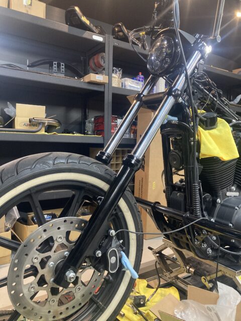 ロングフォーク化に合わせてブレーキラインも長いものに変更します。最適な長さを選定して組み上げていきます。