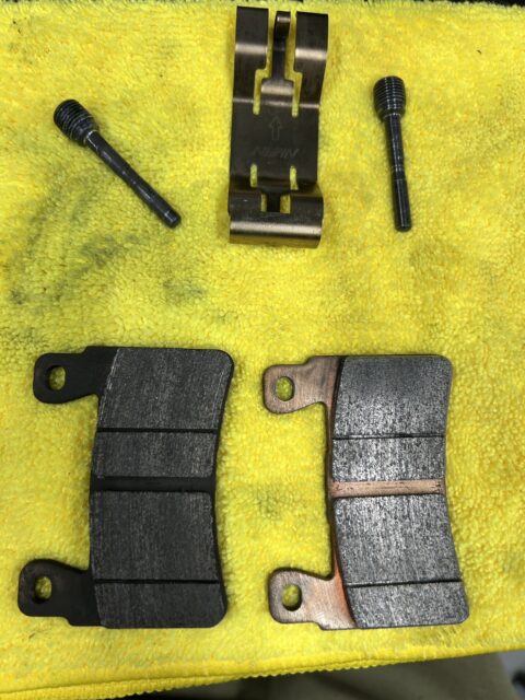 ブレーキパッドはしっかりとダストを清掃し、バリや角の出た部分は必要に応じて削ぎ落とし、パッド背面にはブレーキ鳴きを防ぐ為、消音グリスをダストが溜まる原因にならない程度に薄く塗布します。