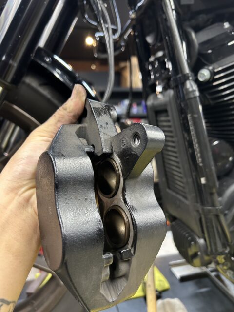 キャリパー清掃はしっかりピストンを揉み出してダストを洗い流し、専用の潤滑油でピストンの動きを滑らかにさせます。