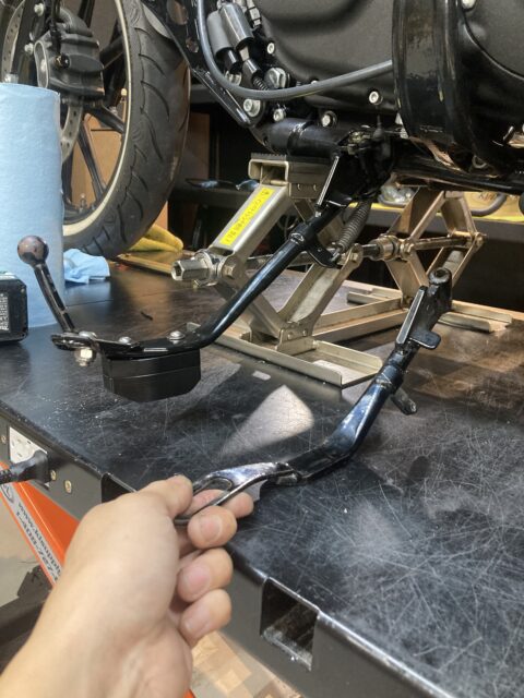 ブレーキラインなどの選定、取り付けが完了し、ロングフォーク化に伴って長さが足りなくなるABSセンサーの配線延長も完了しました。そして今回はサイドスタンドの交換です!