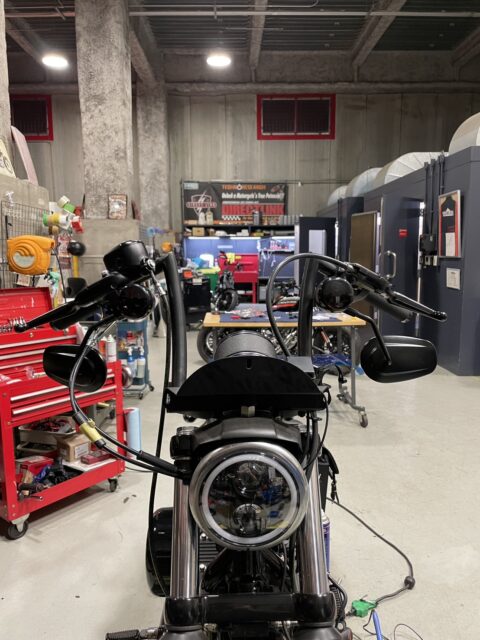 空冷スポーツスターは、元々、ウインカーやスイッチ類の配線がむき出しですが、このハンドルだと配線をハンドルバーの中に隠せるので、ハンドル周りがスッキリします。