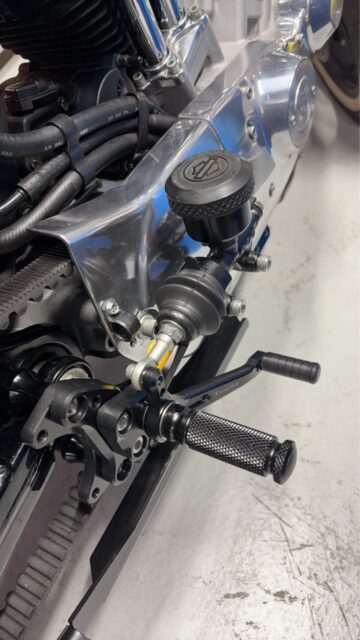 1番のキモとなるバックステップ化です。TRAMP製のバックステップキットですが、かなりカッコいいです。