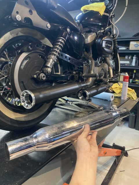 マフラーもヒートシールドもクロームでしたが、今回はマットブラック!ヒートシールドもブラックリペイントでマットブラックになります。
