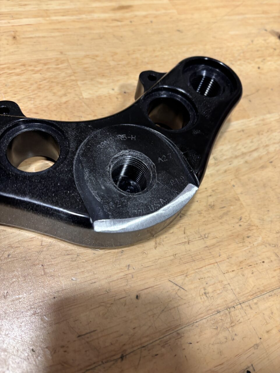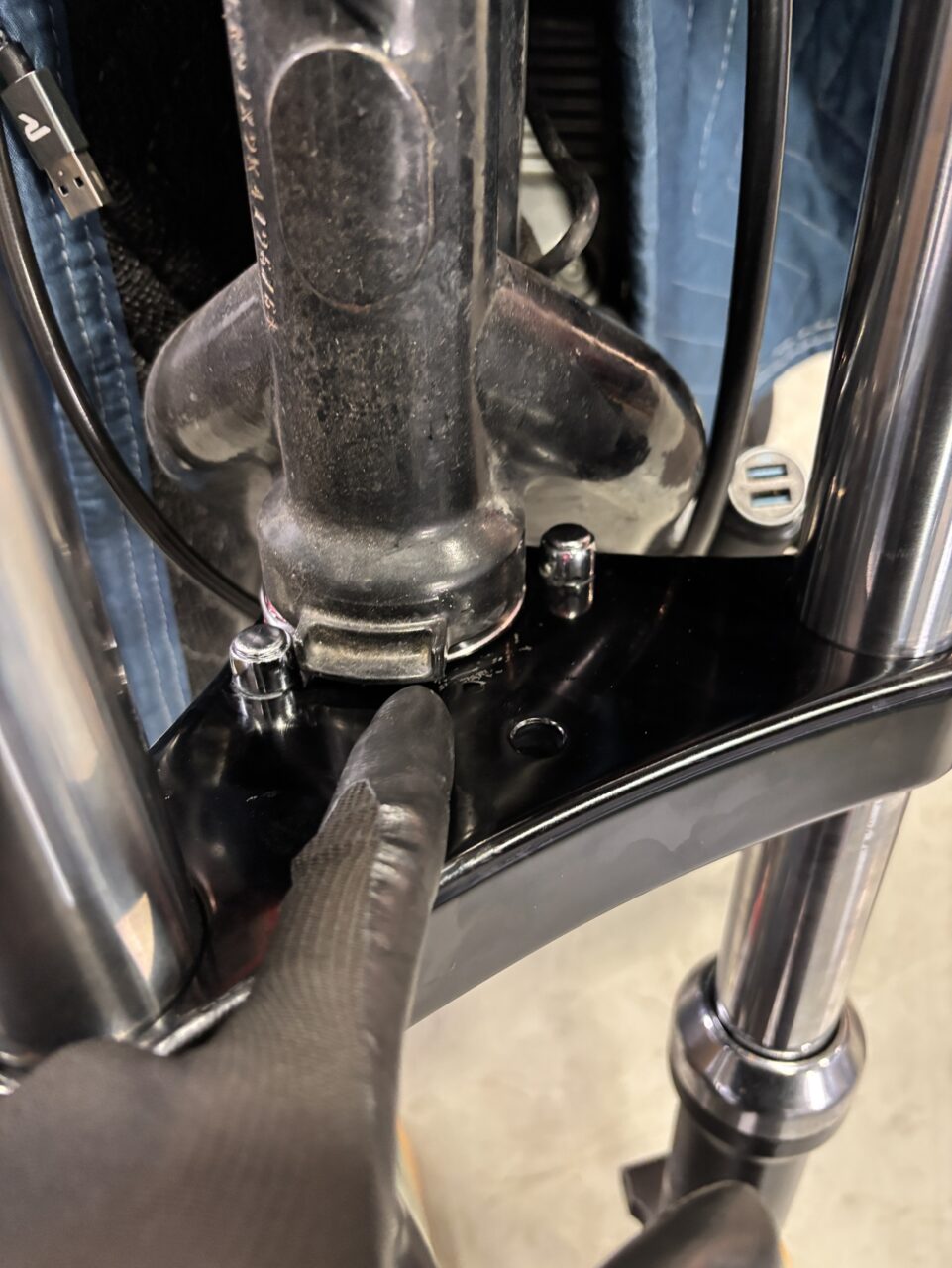 ステムを交換する際、ベアリングの締め具合でハンドリングの重さが決まりますが、この締め付ける前に三又がフレームに当たってしまい、調整が効かない状態でした。