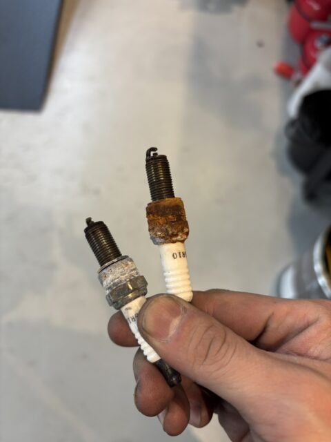 今回、車検整備と点検をさせて頂き、気になった箇所はプラグです。M8はツインプラグなので外側のプラグ2本と対角のタンク下に2本プラグがあり、計4本のスパークプラグを使用しています。