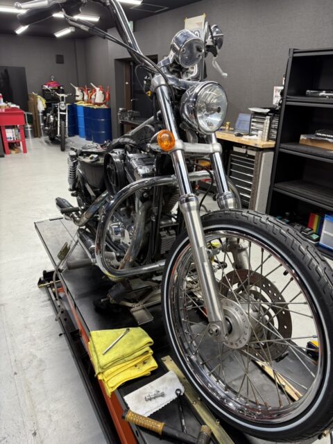 過去に名古屋店では、XL1200NSのロングフォークを3台ほどカスタムさせて頂きましたが、NSのフロントタイヤのインチ数は19インチです。そして、今回は21インチのXL1200Vでロングフォークとなりますので、どんなシルエットになるのか楽しみですね。