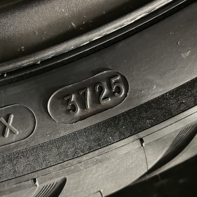 タイヤの横側には4桁の製造番号が記載されていて下2桁が西暦何年、上2桁が何周目となります。(画像だと2025年37週目に製造)